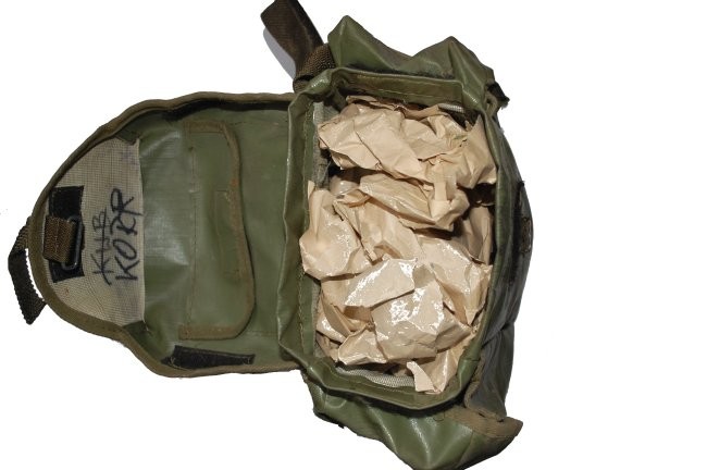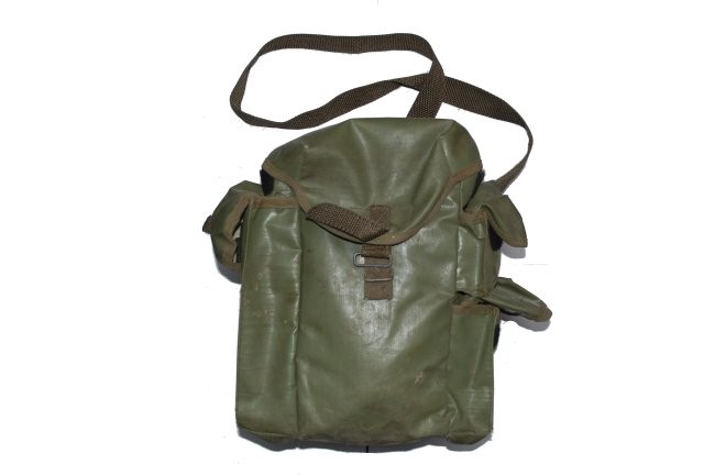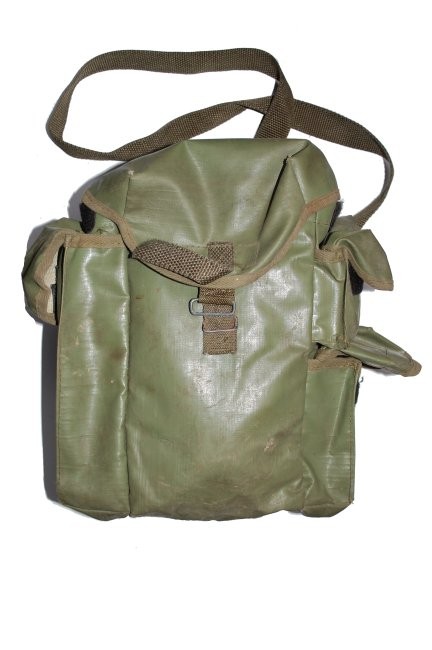the buckle. This type of bag used to transport MP5 gas masks. Green color.