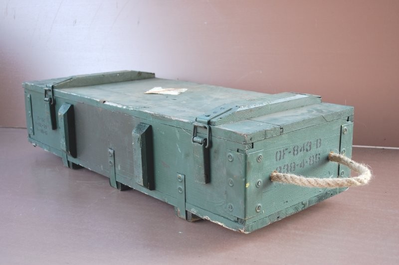 Skrzynka wojskowa wyposażona w mocne sznury transportowe. Solidnie wykonana, masywna z grubej deski, zaimpregnowana lakierem.