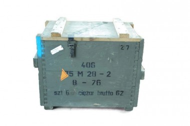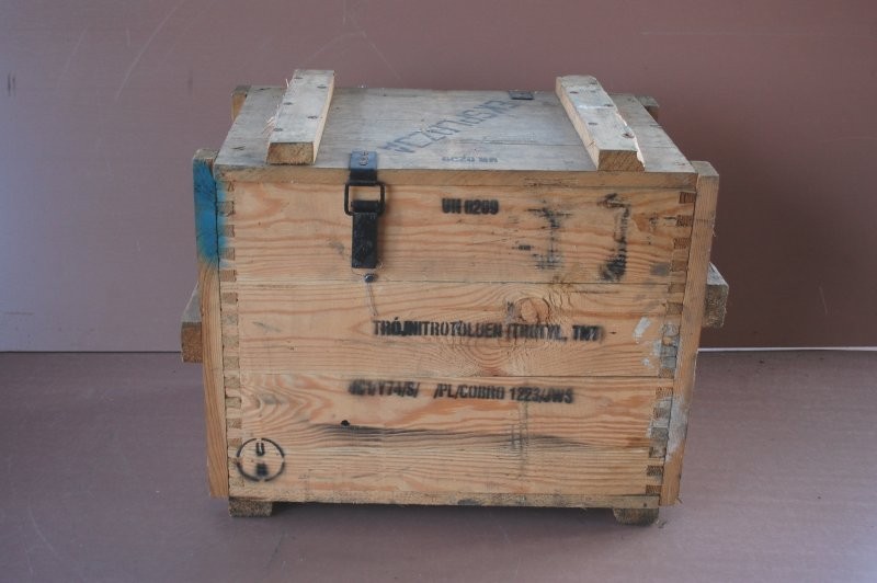 Drewniana skrzynia eksplozja wojskowa po materiałach wybuchowych TNT.