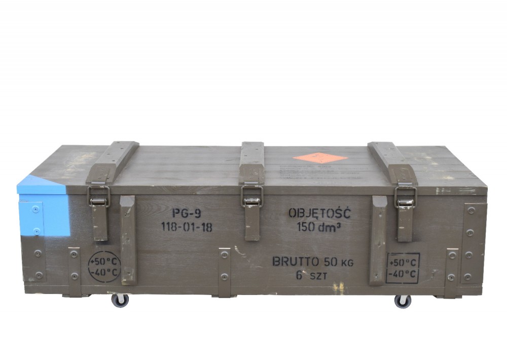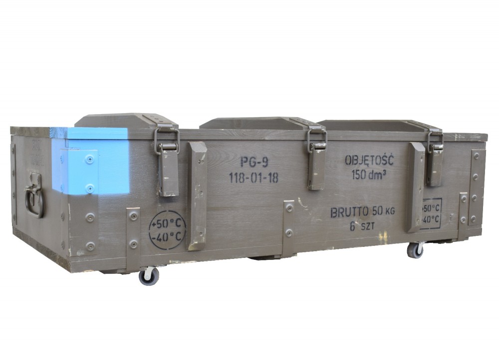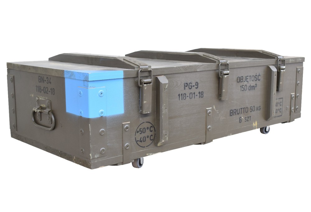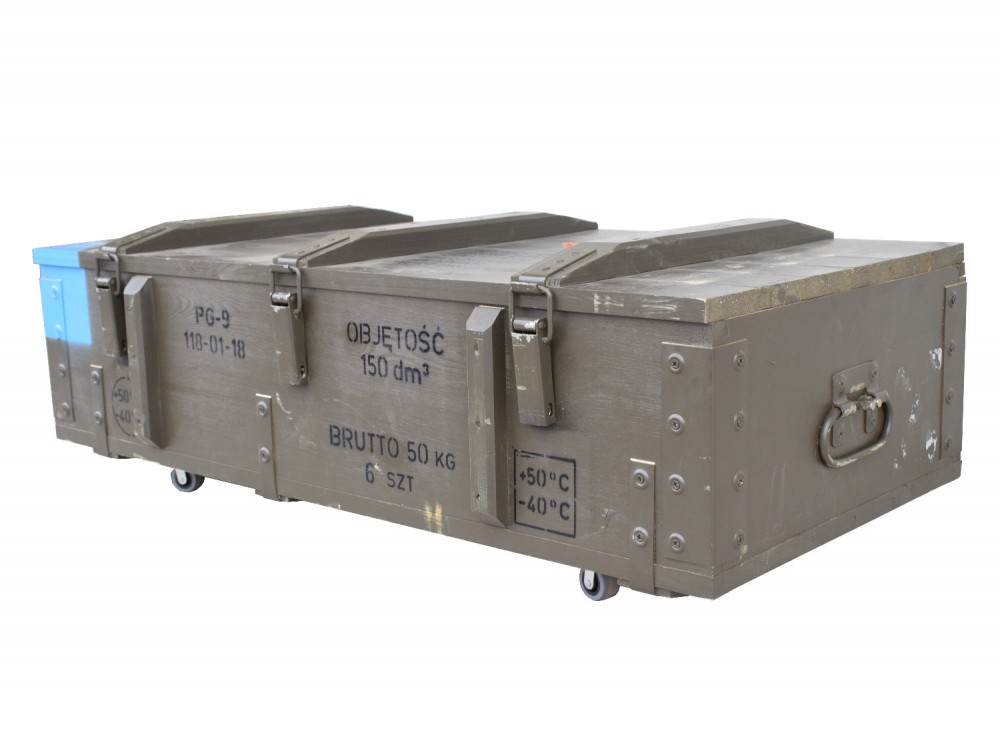Niepowtarzalny pojemnik na kółkach wykonany z oryginalnej drewnianej skrzyni wojskowej.