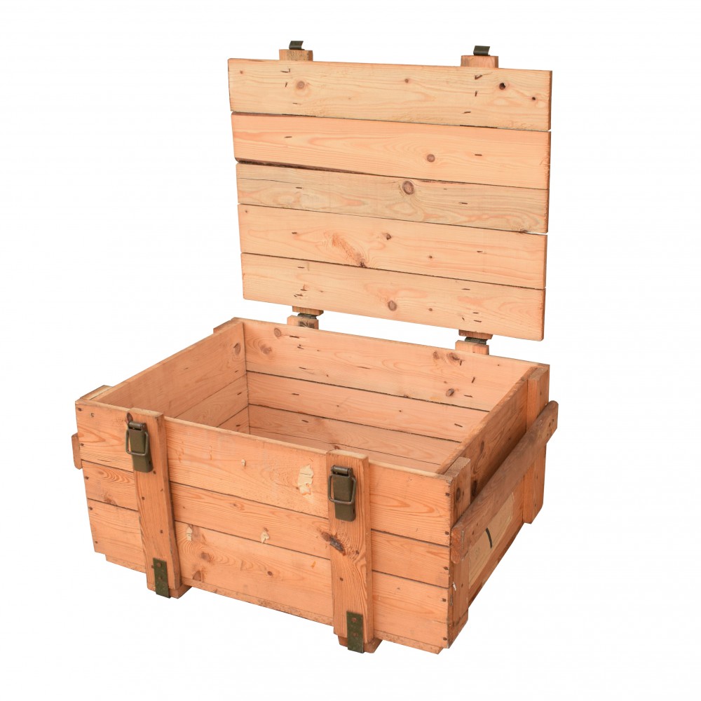 Oryginalna skrzynka wojskowa nie malowana. Skrzynia solidnie wykonana, zamykana na metalowe zatrzaski lub na klamrę z motylkiem, wyposażona w uchwyty transportowe. Skrzynie są czyste, niezaolejone