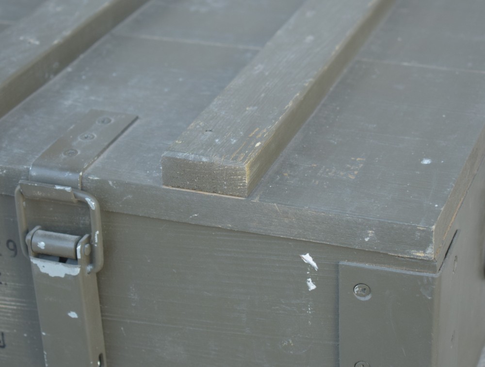 Wojskowa, nieduża skrzynia transportowa po ćwiczebnych materiałach wybuchowych.