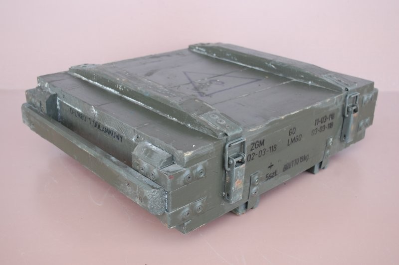 Oryginalna skrzynka drewniana wojskowa w kolorze zielonym, po polskich moździerzach kaliber 60mm zwanych LM60. Skrzynka prezentuje się bardzo ładnie na zewnątrz jaki i wewnątrz. Skrzynka idealna na narzędzia do ogrodu itp ... ile potrzeb tyle zastosowań. Wyposażona w uchwyty transportowe, metalowe klamerki oraz stalowe okucia co czynie skrzynkę mocną i solidną. Wewnątrz czysne pachnące drewno.