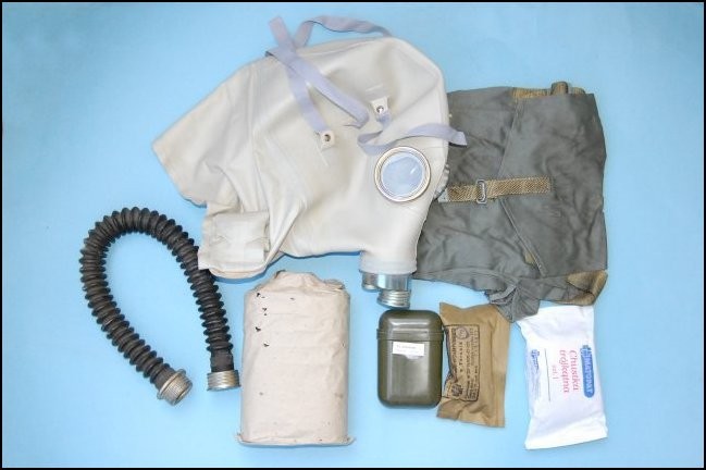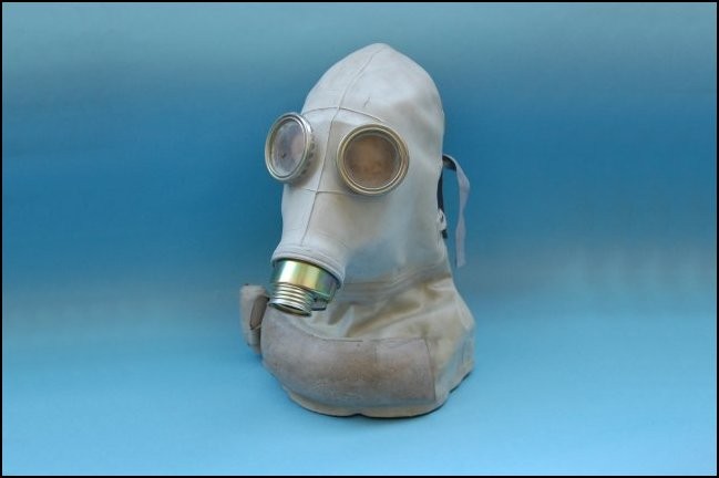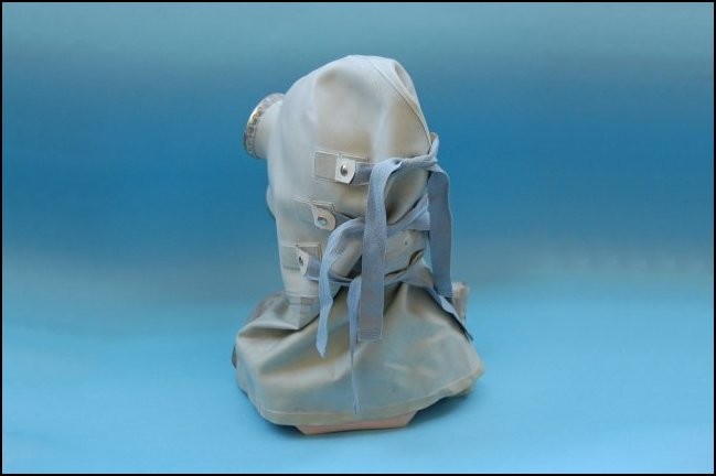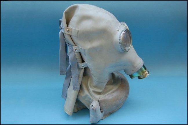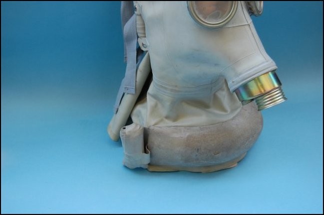 Oryginalna maska przeciwgazowa SR-1 typu słoń dla żołnierza rannego w głowę. Komplet wraz z pochłaniaczem torbą i rurką.