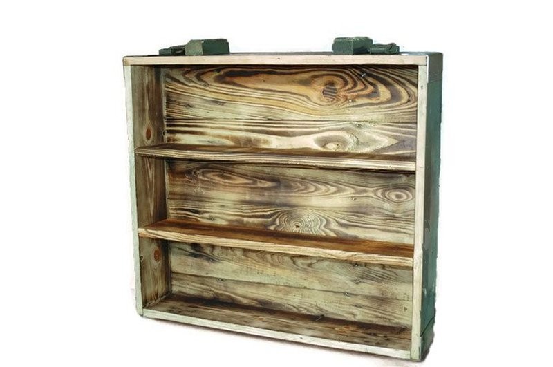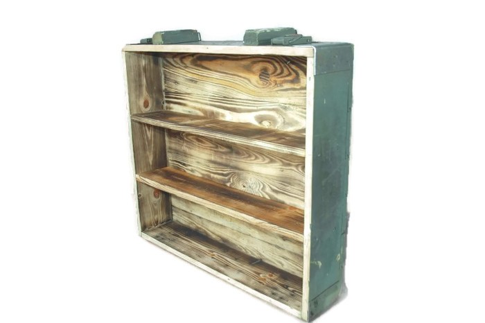 Drewno wewnątrz opalane, na zewnątrz oryginalny wojskowy kolor zielony. Narożniki zewnętrzne wyposażone w metalowe kątowniki, po bokach widoczne napisy TROTYL itp. - idealnie wkomponuje w militarne wnętrze. Półka posiada w zestawie uchwyty do powieszenia, wysyłamy w całości więc po odebraniu paczki możesz gotową półkę wieszać na ścianę, nie trzeba nic skręcać ani składać, pomoc sąsiada będzie zbędna.